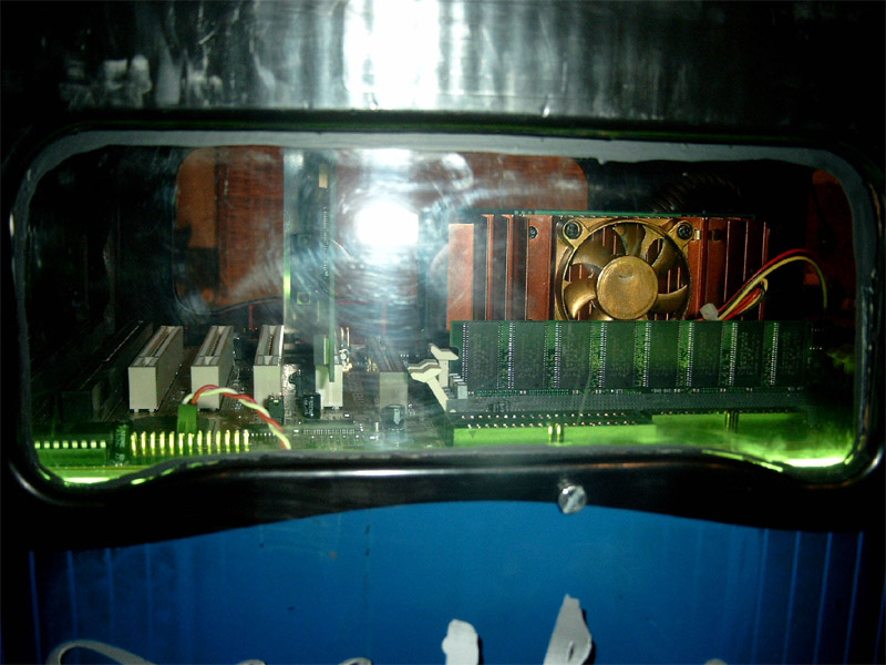 Falls ihr es noch nicht mitbekommen haben solltet, der ALC CLAN hat fieberhaft an einem Server gearbeitet, von dem später Bilder, Videos und andere Dateien heruntergeladen werden können. Wir haben hier einige Bilder zusammengetragen um euch zu zeigen, wie unser Server aussieht und wie wir bei der Arbeit vorgegangen sind. DER AUFBAU Wie man in den oberen Bildern erkennen kann, mussten wir erst mal die passende hardware zur Verfügung stellen. Bild oben links zeigt die drei wichtigesten Komponenten. Der Bierkasten, der als Gehäuse verwendet wird, das Blech, unter dem später die HDDs, das NT und das CD ROM Laufwerk untergebracht werden und auf dem das Board mit den einzelnen Karten gelegt wird. Die ganzen Teile haben wir aus alten Rechnern ausgebaut, die man im oberen mittleren Bild sehen kann. Um das Gerät etwas interessanter aussehen zu lassen, haben wir das Blech mit goldener Farbe besprüht, sieht viel besser so aus! Links sieht man den Arbeitskeller, der uns eine staubfreie Umgebung bietet *g*. Im mittleren Bild einmal eine seitliche Ansicht unserer geilen Kiste. Rechts sieht man Frankenheimer, Veltins und Jägermeister bei der Arbeit. Dann wurde richtig gearbeitet, CD Laufwerk muss reinpassen, ein NT haben wir schon eingebaut wie man im mittleren Bild sieht. Rechts zeigt den Server wie er später ungefähr aussehen wird, das Blech ist wie oben schon genannt, mittlerweile vergoldet, unter dem Blech haben wir schon eine kleine HDD, untergebracht, ein CD-ROM Laufwerk ist drin und das NT. Nach diesen Arbeitsschritten besorgten wir aus einem namenhaften Baumarkt , dessen Namen wir hier aus werbetechnischen Gründen nicht nennen dürfen (Soviel sei gesagt: Fängt mit O an und hört mit BI auf). Um nun einen ausreichenden Schutz der Inneren des Servers zu gewährleisten, installierten wir eine Plexiglasscheibe auf seiner Oberseite, sowie an den Seiten, die wir mit Hilfe einer Kreissäge zurechtschnitten.Um das ohnehin schon eindrucksfolle Gehäuse noch weiter aufzuwerten, bestellten wir eine grüne Kathode und ein Window-Aufkleber mit einem Atom Symbol. Bild links zeigt den nun fast fertigen Server von der Seite, man beachte den Startknopf der aus einem RiGO Kronkorken besteht. Zur Verziehrung des Hauptstromkabels benutzen wir einen schwarzen PVC-Schlauch wie man ebenfalls erkennen kann. Das mittlere Bild zeigt den Server von einer etwas grösseren Distanz, wobei hier noch nicht die Schutzfolie der Plexiglasscheibe entfernt wurde und sie im Moment einen trüben und zerkrazten Eindruck macht. Auch der Window Aufkleber ist in dieser Aufnahme noch nicht zu erkennen. Bild rechts zeigt den Server von oben, auch hier sei noch einmal die durch die Schutzfolie hervorgerufene Trübung zu erwähnen, aber schon gut zu erkennen ist der vergoldete Mainboardschlitten und das schon fertig montierte Mainboard. Hier noch ein paar nachgetragene Bilder, wie die Hardware zusammengesetzt wurde. Links kann man unseren CPU Kühlkörper erkennen, den wir ebenfalls vergoldet haben, der Lüfter wurde ebenfalls vergoldet. Die durch die Farbe entstandene Wärmestauung ist nur minimal und bei unserer so niedrig getakteten CPU nicht weiter relevant. Auf dem mittleren Photo sieht man noch einmal das gesamte Board, mit CPU, Kühler, RAM. Hier kann man schon ganz gut erkennen, wie der vergoldete Kühler später wirken wird. Der Kasten hat gestalt angenommen und da jetzt alles noch schön offen liegt und verändert werden kann, haben wir schon früh damit begonnen, Betriebssystem und sonstige Software zu installieren. (Anmerkung) Die dort zu sehenden Karten sind nie verbaut worden. Die noname Netzwerkkarte haben wir durch eine 3COM Fast Etherlink ersetzt, die im Hintergrund zu sehende ATI Rage PRO war aufgrund der nur minimalen Leistungsansprüche nicht nötig. Wir haben sie durch eine ATI 2MB PCI Variante ausgetauscht, die ihren Dienst genauso erfüllt, ausserdem ist die Wärmeentwicklung deutlich geringe, was bei unserem Kasten wichtig ist, da nur ein NT und ein CPU Lüfter vorhanden sind. Nach langem Arbeiten haben wir unseren Server endlich fertiggestellt. Auf der kleinen, aber durchaus ausreichenden HDD (3,2GB) haben wir Windows 2000 installiert, die gesamten Bilder und Photos, Videos etc. untergebracht und das Netzwerk eingerichtet. Bild Links zeigt den fertigen Server von der Seite, im mittleren Bild haben wir den Server mit dem jetzt deutlich zu erkennenden ATOM-Aufkleber photographiert. Bild Rechts zeigt den Server von weiter oben, auch hier kann man sehr deutlich den vergoldeten Mainboardschlitten erkennen, der ganz gut zur Farbe des Motherboards passt. Hier hänge ich noch einmal ein paar Photos vom fertigen Server an. Hier kann man schon ganz deutlich die grüne Kathode sehen, die aber erst nach ein paar Minuten ihre vollkommende Leuchtkraft erreicht hat. Ihr fragt euch vielleicht, warum zwei Kabel zu unserem Bierkasten führen... Das weisse Kabel ist für unsere zweite Leuchte, die ihr im Bild ganz rechts gut sehen könnt. Diese rote Leuchte kann man so manuell ein und ausschalten, je nach Geschmack. Dauert brennen lassen können wir sie nicht, da sie ordentlich wärme produziert, nach ein paar Stunden sollte man sie schon ausschalten.