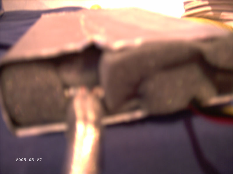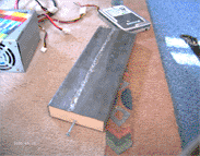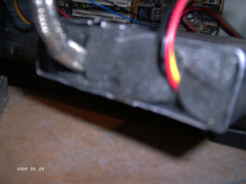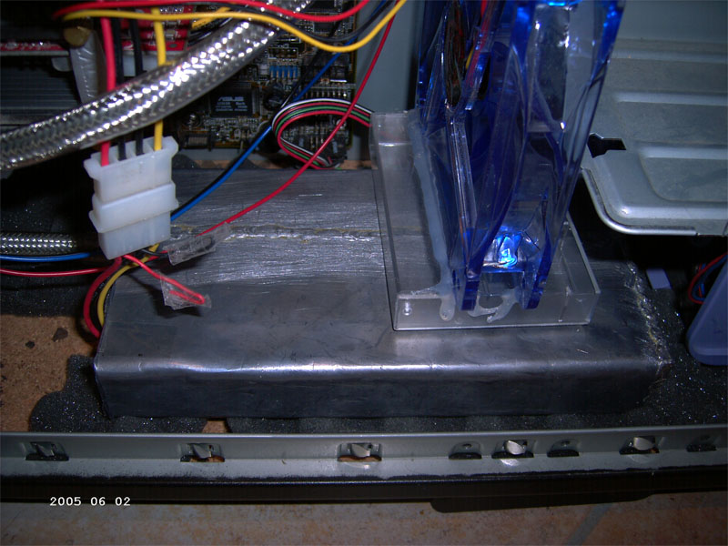 Ist dies geschehen, ist eigentlich auch schon ein Großteil der Arbeit erledigt. Als nächstes habe ich die HDD auf der Unterseite und auch etwas um den Rand ragend mit einer Folie beklebt, da ich so einen Kontakt zwischen dem Blei und der Platine vermeide und so einen möglichen Kurzschluß ausschießen kann. Die Platte wird nun vorsichtig in den Schacht geschoben, am besten man montiert IDE und Stromkabel (auch hier würde sich ein Stromverlängerungskabel empfehlen) direkt mit der Platte, bis man gegen das Ende stößt. Die einzige Schallaustritts-Stelle ist nun noch eben das Loch, durch welches die HDD geschoben wurde. Wie man nun weiter vorgeht bleibt wieder euch überlassen, je nachdem was ihr für Material rumliegen habt. Ich hatte noch etwas Akustik Noppenschaum der sich gut formen und quetschen lässt und so viel Schall schluckt. Möglich wäre aber auch hier mit Bitumen oder Ähnlichem zu arbeiten. Sorry wegen der schlechten Qualität der Nahaufnahme: Optional: Zu guter letzt wird das Blei rund um die HDD noch einmal kräftig angedrückt. Sollte sich dabei herausstellen dass Ihr zuviel Luft drin habt, könnt ihr auch, bevor Ihr mit Schaumstoff dichtmacht, nochmal eine kleine Schicht Blei über die HDD schieben, nachdem Ihr die Seiten schön angedrückt habt. Fertig ist die Konstruktion! Hier noch einmal Bilder des fertigen Werkes, ich bitte das Kabelchaos zu entschuldigen. Der provisorisch daraufgestellte Lüfter dient nicht zur Kühlung der Box sondern zur Kühlung der Grafikkarte links im Bild. Es ist wie gesagt eine Alternative die gewisse Vorteile und auch Nachteile gegenüber der Bit-Box mit sich bringt. Vorteil: Nachteil: - Blei schwer zu besorgen Ergebnis: kurz gesagt....beindruckend :D Vibration aufgrund der großen Masse des Blei´s fast vollständig verschwunden. Ich habe die Konstruktion einfach auf dem Schaumstoff gelegt mit dem mein Gehäuseboden ausgekleidet ist. Gekühlt wird alles durch den vorne eingebauten Papst 12db Lüfter der @5v leise vor sich hinläuft. Die Temp im Idle Modus hat sich bei 27C° eingependelt bei ca. 19-20Grad Umgebungstemp. Unter Last erreiche ich Temps von 30-32 C°. Beim HDD Modell handelt es sich um eine Samsung SpinPoint P80 SP1614N mit lautem JVC Motor. Viel Spaß beim nachbauen....