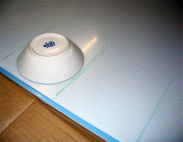 Zuerst mussten wir die großen Platten in handlichere Stücke schneiden, damit Sie beim anschließenden Rundschneiden nicht brechen. Hierzu legten wir eine Schablone (in diesem Fall ein Teller mit 13cm Durchmesser) an und legten die groben Schnittlinien fest.