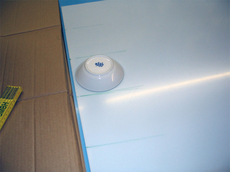 Bestellt haben wir jetzt 2 Platten Acrylglas mit den jeweiligen Maßen 72x75x0,3 cm (entspricht etwa 25 Kreisen pro Platte) in der Farbe Opalweiß. Milchglas selbst herzustellen und das auch noch gleichmäßig erschien uns etwas zu heikel. Die Platten haben eine Lichtdurchlässigkeit von etwa 55%. Durchschauen kann man auch im beleuchteten Zustand nicht, sie geben aber das Licht sehr gleichmäßig ab und sehen auch ohne Beleuchtung recht interessant aus.