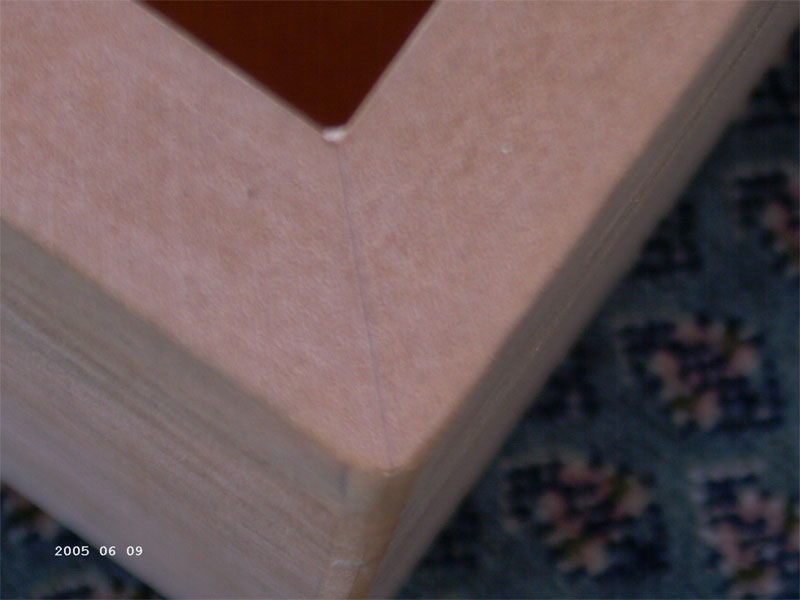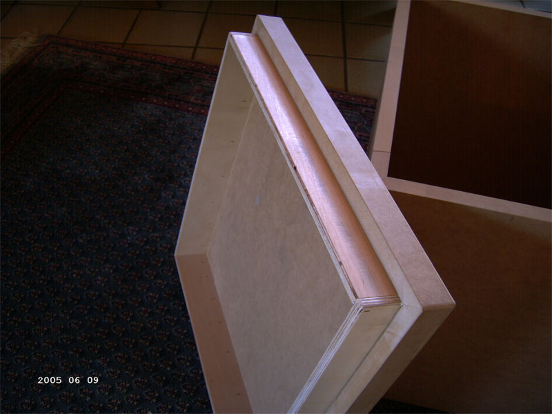Das Holz hat eine Wandstärke von 19mm und wurde mit einem schrägen Schnitt angefertigt (siehe rechts Nahaufnahme) damit die Hölzer sich schön verkeilen und eine größere Auflagefläche bieten. Das Ganze ist lediglich geleimt, ohne störende Schrauben darin.
