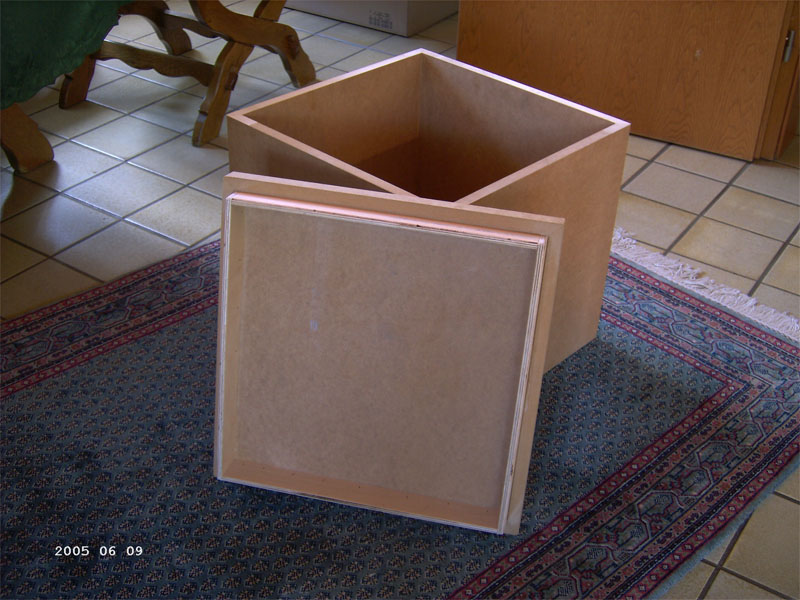 Der Deckel wird einfach, wie bei einem Schuhkarton, oben aufgesetzt und liegt absolut bündig auf, mit ihm wird auch erst die vollkommen viereckige Form erreicht. Wir müssen vermutlich noch etwas Holz abschleifen, denn der Deckel lässt sich bislang nur sehr schwer abnehmen, weil er noch nicht so oft geöffnet wurde.