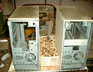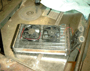 **** Casemod : BLUE LIGHTNING - Der Aufbau**** ****UPDATE**** Bilder vom 20.02.2004 Diesmal: Erste Testläufe des Wasserkreislaufes und Anpassung der Tower Wir haben die ersten freien Stunden nach der Schule natürlich sofort wieder genutzt, um an unserem aktuellen Projekt weiterzuarbeiten. Nach den groben Arbeiten geht es nun langsam ins Detail, jeder weitere Schritt sollte deshalb gut überlegt sein, denn jetzt kann man nicht mehr viel rückgängig machen. Da wir uns ja längere Zeit Gedanken darüber gemacht hatten, wie wir das Wasser ausreichend kühlen sollten, kamen wir dann doch zu dem Entschluss, dass ein Radiator für weitere Arbeiten unbedingt notwendig ist, weshalb sich Veltins und Jägermeister sofort auf die Suche nach einem passenden Gerät machten. Wichtig auch hier; der Kostenfaktor. Auf einem Schrottplatz wurden sie schließlich fündig, ein großer Radiator (wir vermuten stark von einem Motorrad) lag dort herum. Kosten für uns : 5€. Dann mussten wir noch eine neue Pumpe besorgen, die übernahm Jägermeister, denn bei der alten Pumpe verabschiedeten sich die Schaufelräder . Die neue 300L/h Eheim Pumpe kostete uns im Baumarkt 10€ .