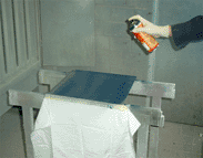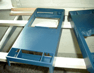 Jetzt folgten die beiden Gehäusedeckel, an der sich jeweils noch eine Seitenwand befindet. Da wir inzwischen merkten, dass die blaue Farbe knapp wird, bzw. nicht ausreichen würde, entschlossen wir uns, wie auch damals ursprünglich geplant, die Deckel ebenfalls in chrom zu lackieren. Hierzu klebten wir das Ganze wieder in 2 Bereiche ab, und begannen mit der blauen Seitentür anschließend erfolgte die letzte Lackierung, nämlich die chromfarbene Deckellackierung. Am Ende sah das Ganze dann so aus: