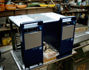 **** Casemod : BLUE LIGHTNING - Der Aufbau**** **** UPDATE VOM 14. in den 15.***** Bearbeitung der Gehäuse und deren Befestigung Bis 0 ³°Uhr haben wir jetzt bei Veltins noch gesessen und an den Casemods weitergearbeitet. Und ich kann mit Stolz sagen, dass wir wirklich viel geschafft haben. Zuerst haben wir die bis dahin noch lose rumliegenden Gehäusehüllen mit den beiden Gehäusen verschraubt, wie es vorgesehen war. Danach richteten wir die Gehäuse auf der Bodenplatte so aus, dass an den Seiten kein Holz mehr zu sehen ist. Nun musste die bis dahin nur grob zugeschnittene Plexiglasscheibe , die oben einen Abschluss bilden soll , noch weiter zugeschnitten werden, so dass an den Rändern nichts übersteht. Gleichzeitig bohrten wir auch die passenden Löcher in die Scheibe, damit sie später gut befestigt werden kann. Die Schutzfolie haben wir aber aus Gründen des Kratzschutzes beim Arbeiten aber noch nicht abgezogen, obwohl ich zugeben muss, das Rigo und ich das Ganze auch gern mal ohne gesehen hätten. ;-) Danach überlegten wir kurz, ob wir die übriggebliebene Plexischeibe nun vorne als Abschluss benutzen sollten sowie hinten am Gehäuse oder ob wir die dicke Platte zunächst für die Window Seitentüren benutzen sollten. Wir entschieden und für das Zweitere. Nachdem wir diese ebenfalls passend zugeschnitten hatten und ich die Metallstücke mit einem normalen Fön gründlich aufgeheizt hatte, damit der Heißkleber auf dem kalten Metall nicht sofort abkühlt und aushärtet, setzten wir die Scheiben auf und schmierten noch eine dicke Schicht Kleber an den Rand der Platte um sie noch besser zu befestigen. Auch hier haben wir noch eine Schutzfolie drangelassen.