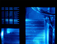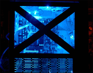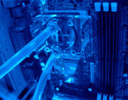 **** Casemod : BLUE LIGHTNING **** Ich hoffe jeder von euch hat unser "Projekt Blue Lighting " durchlesen ;-) und hat den Bau schon von Anfang an mitverfolgt. Da wir uns aber gedacht haben, dass es fast unzumutbar ist jemanden die 20 Seiten Herstellungsgeschichte zu zeigen, wenn er nur an fertigen Ergebnissen interessiert ist, werde ich nun hier ein neues Blatt aufmachen, in welchem einfach nur das "fertige Projekt" vorgestellt wird. Natürlich gibt es hier und da noch eine Kleinigkeit zu verbessern, das alles aber noch hier aufzuzählen ist sinnlos und erfüllt auch nicht seinen Zweck. So werden z.B. noch einige verchromte Lüfter vor den Radiator gesetzt. Nun zum Projekt: Idee: 2 identische Gehäuse (aus der guten alten IBM Monopol Zeit) werden auf einer Bodenplatte befestigt und durch Kabel miteinander verbunden. In dem entstehenden Freiraum wird eine "offene Wasserkühlung" in Form von einem grossen Steinbecken betrieben. Das Ganze ist durch Plexiglas-Scheiben vorne, hinten und durch den Deckel geschützt. In den Seiten werden Fenster aus Plexiglas eingebaut. Der eine Tower fungiert als Strom und Kühlturm durch den grossen Radiator, im anderen Tower sind die üblichen Hardwarekomponenten untergebracht. Hier sind die Bilder:
